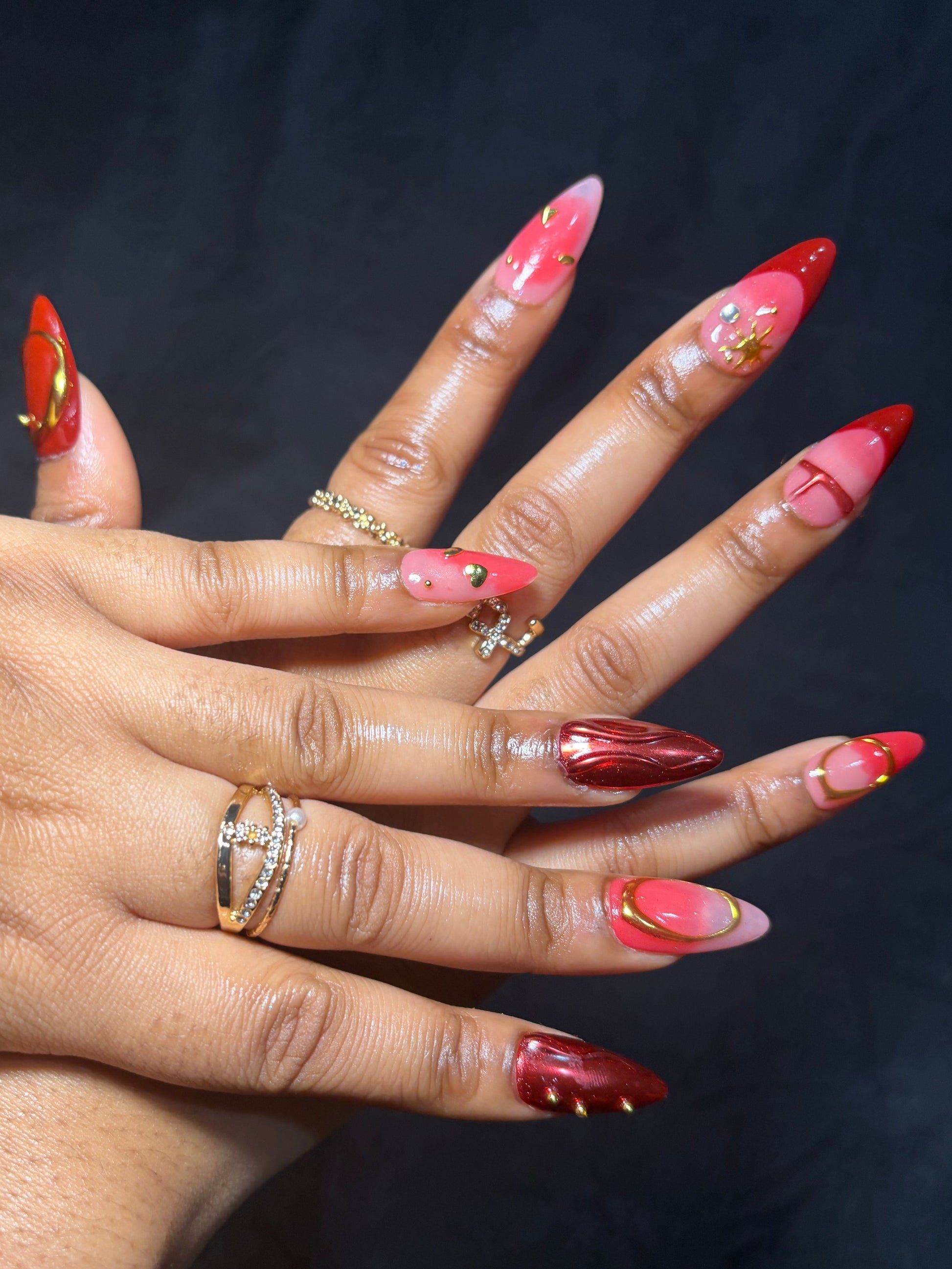 Short almond nails with burgundy and red shades with touches of gold. The perfect fall nails.